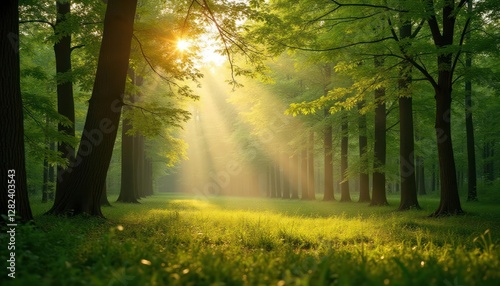 © Achmad, Fototapeta premium Sunbeams Dancing Through a Lush Green Forest