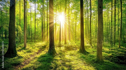 © Fikri, Obraz premium Sunbeams Dancing Through a Lush Green Forest