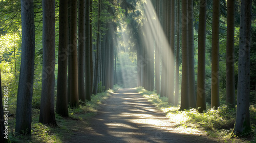© StirfryMoJi, Naklejka premium Sunbeams Dancing Through the Forest