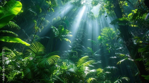 Fototapeta premium Sunbeams filter through a lush forest canopy, revealing vibrant greenery and...