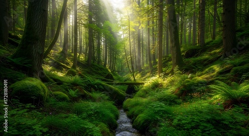 © Shreya777, Obraz premium Sunbeams filter through a lush mosscovered forest illuminating a small stream