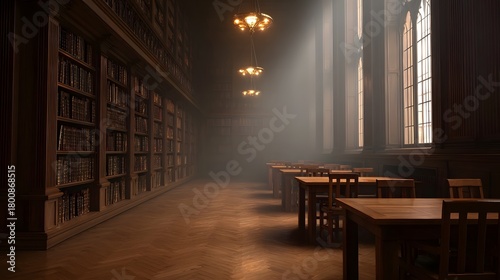 Fototapeta premium Sunbeams filter through mist in a grand historic library filled with towering bookshelves and study tables