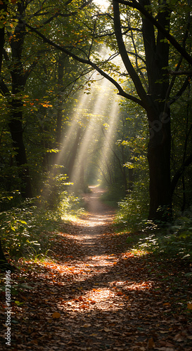 © Good, Obraz premium Sunbeams filter through the trees, illuminating a forest path covered in fallen leaves, creating a serene and mystical atmosphere.