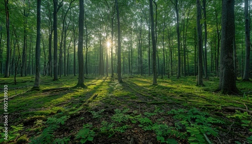 © boler, Obraz premium Sunbeams Filtering Through a Dense Green Forest Canopy