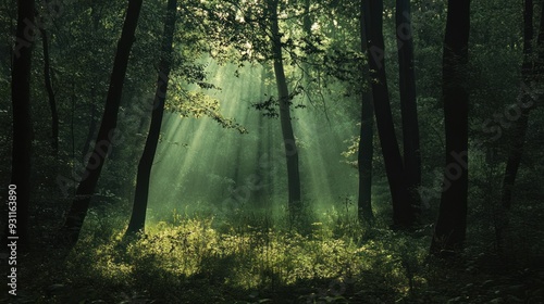 Obraz premium Sunbeams Filtering Through a Foggy Forest