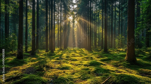 Fototapeta premium Sunbeams Filtering Through a Lush Forest