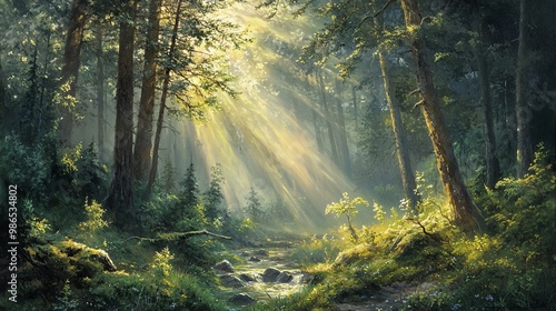 Fototapeta premium Sunbeams Filtering Through a Lush Forest With a Stream