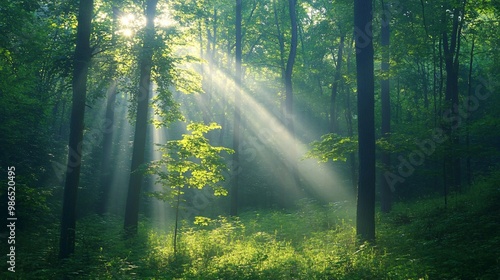 Fototapeta premium Sunbeams Filtering Through a Lush Green Forest