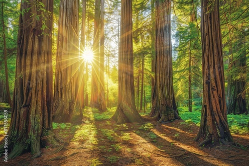 Fototapeta premium Sunbeams filtering through a majestic forest of tall trees.