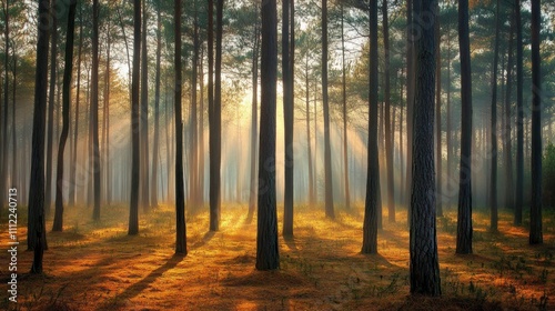 Fototapeta premium Sunbeams Filtering Through a Misty Pine Forest