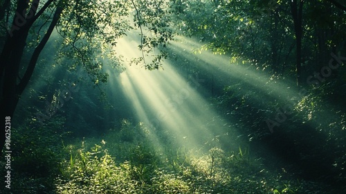 Obraz premium Sunbeams Filtering Through Dense Forest Canopy