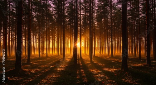 © Agus, Obraz premium Sunbeams filtering through dense forest trees.
