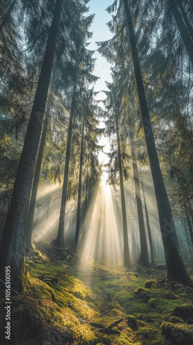 Fototapeta premium Sunbeams filtering through fog in majestic forest