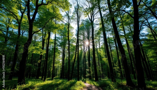 Fototapeta premium Sunbeams filtering through lush green forest canopy.
