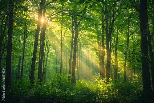 © Israt, Obraz premium Sunbeams filtering through lush green forest canopy