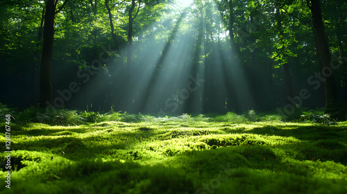 Fototapeta premium Sunbeams filtering through lush green forest, illuminating mossy forest floor