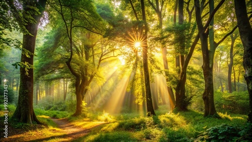 Fototapeta premium Sunbeams filtering through the canopy of a verdant forest, illuminating a...