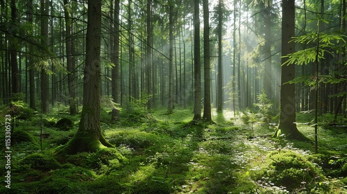 Obraz premium Sunbeams filtering through the trees in a forest.