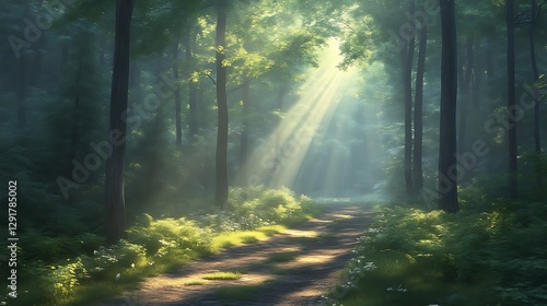 Obraz premium Sunbeams Forest Path, Peaceful Scenery, Nature