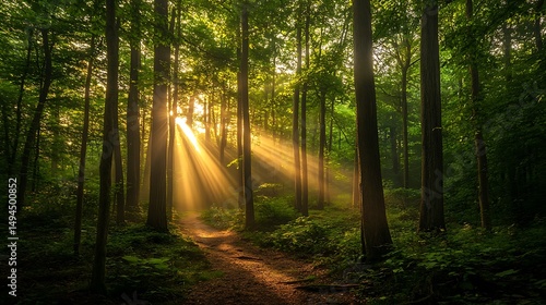 Fototapeta premium Sunbeams Forest Path Sunrise.