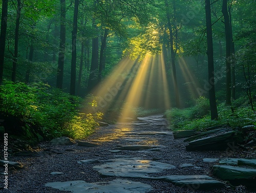 © Al, Obraz premium Sunbeams Forest Path Trail.