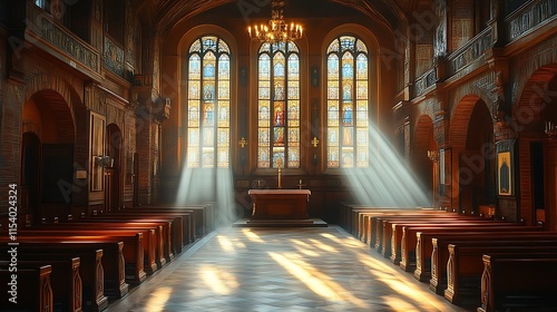 Fototapeta premium Sunbeams illuminate a church's stained-glass windows and altar.