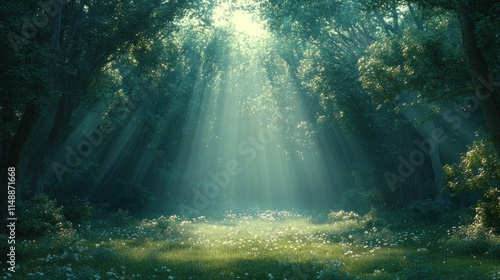 © Bejo Studio, Fototapeta premium Sunbeams illuminate a clearing in a misty forest.