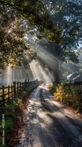 © Mossy, Naklejka premium Sunbeams illuminate a country lane