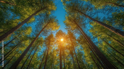 Obraz premium Sunbeams Illuminate a Forest of Tall Trees from Below
