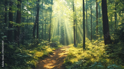 Fototapeta premium Sunbeams illuminate a forest path. (1)