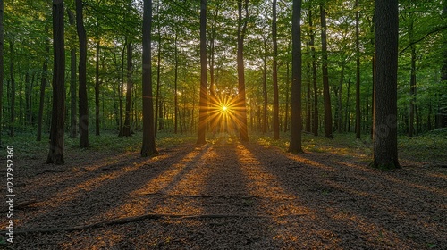 © Zaenal, Fototapeta premium Sunbeams Illuminate a Forest Path at Sunset