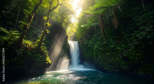 Fototapeta premium Sunbeams illuminate a hidden waterfall cascading into a lush, green jungle pool. Tranquil scene of nature.