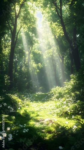 Fototapeta premium Sunbeams illuminate a lush green forest floor, creating a magical atmosphere.