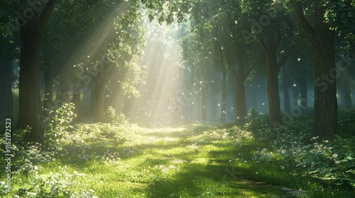 © afif, Obraz premium Sunbeams illuminate a magical forest path.