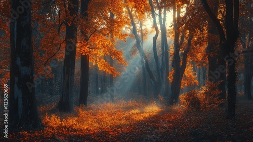© sandi, Fototapeta premium Sunbeams illuminate a misty autumn forest with vibrant orange leaves and tall trees.
