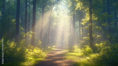 © Lexyat, Fototapeta premium Sunbeams illuminate a misty forest path.