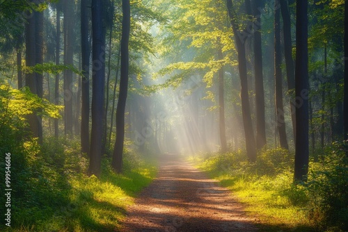 Obraz premium Sunbeams illuminate a misty forest path, creating a magical atmosphere with...