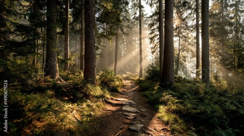 © khumthong, Obraz premium Sunbeams Illuminate a Misty Forest Path Serene Nature Trail in Woods