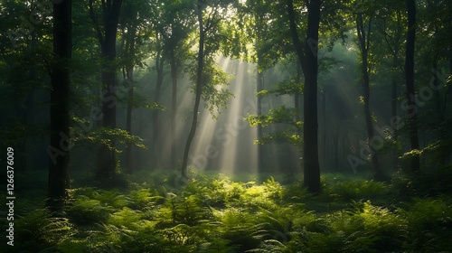 Fototapeta premium Sunbeams Illuminate A Misty Green Forest