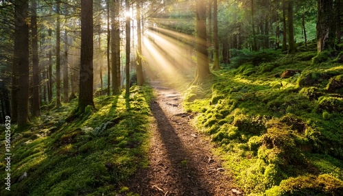 Obraz premium sunbeams illuminate a mossy forest path
