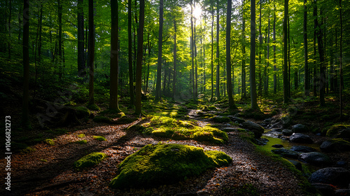© Mohan, Fototapeta premium Sunbeams illuminate a mossy forest path, with a small stream running through the center.