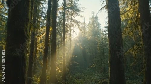 © kreasi Visual, Fototapeta premium Sunbeams Illuminate a Mossy Temperate Rainforest