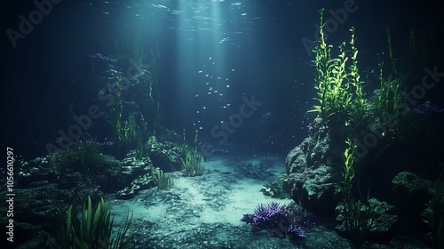 Fototapeta premium Sunbeams illuminate a mysterious underwater landscape with seaweed, rocks,...