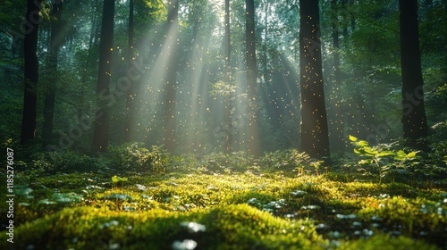 Fototapeta premium Sunbeams illuminate a mystical forest floor covered in moss, with light...