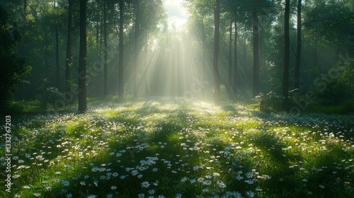 Fototapeta premium Sunbeams Illuminate a Mystical Forest Meadow