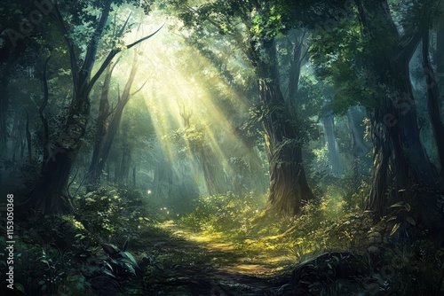© Abdi, Obraz premium Sunbeams illuminate a mystical forest path. (2)