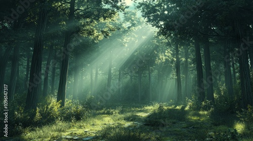 Obraz premium Sunbeams illuminate a mystical forest path, dappled light filtering through...