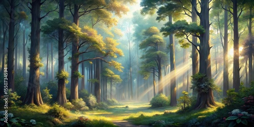 © PloyJai, Obraz premium Sunbeams Illuminate a Mystical Forest Path Where Lush Greenery and Tall Trees Create a Serene and Tranquil Atmosphere