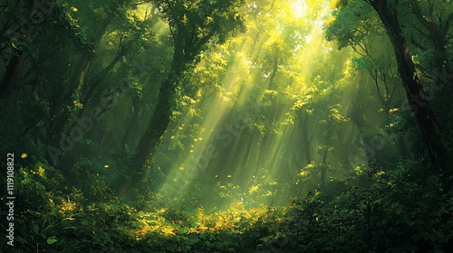 © Bayu, Obraz premium Sunbeams illuminate a mystical, green forest path.