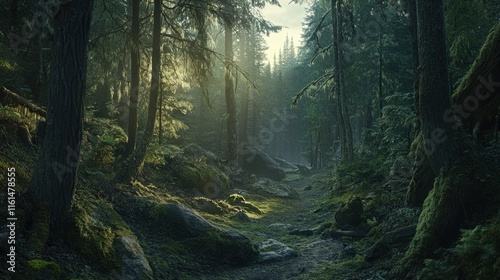 Fototapeta premium Sunbeams illuminate a mystical, moss-covered forest path winding through tall...